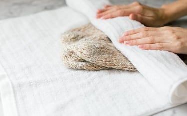 Išskalbusus mezginį, svarbu tinkamai nusausinti. Vandens perteklių iš mezginio pašaliname, lengvais paspaudimais su rankšluosčiu. Kai mezginys tampa sausesnis, suteikiame formą ir paruošiame džiovinimui.